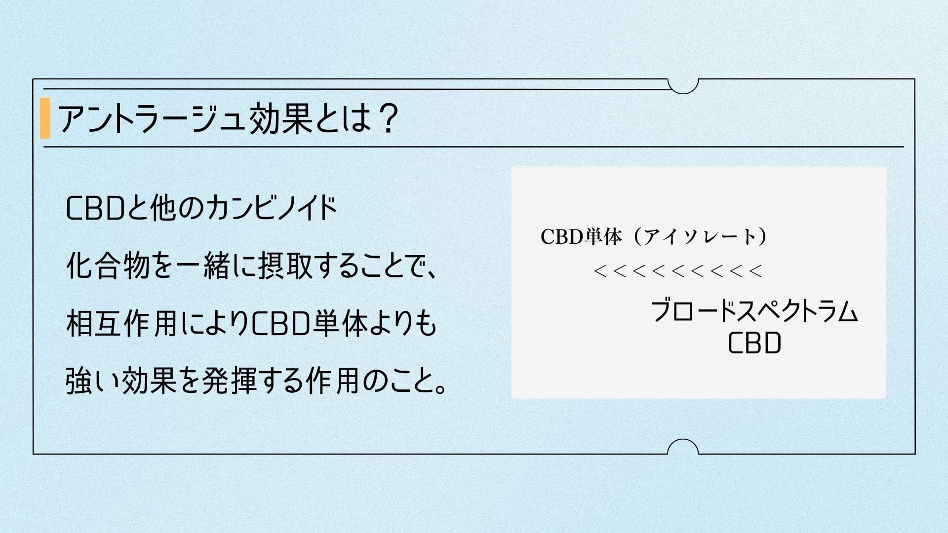 大麻草に含まれる複数のカンナビノイドやテルペンなどの化合物が相互に作用することで、単一の成分を摂取するよりも高い効果を発揮する「相乗効果」を指します。