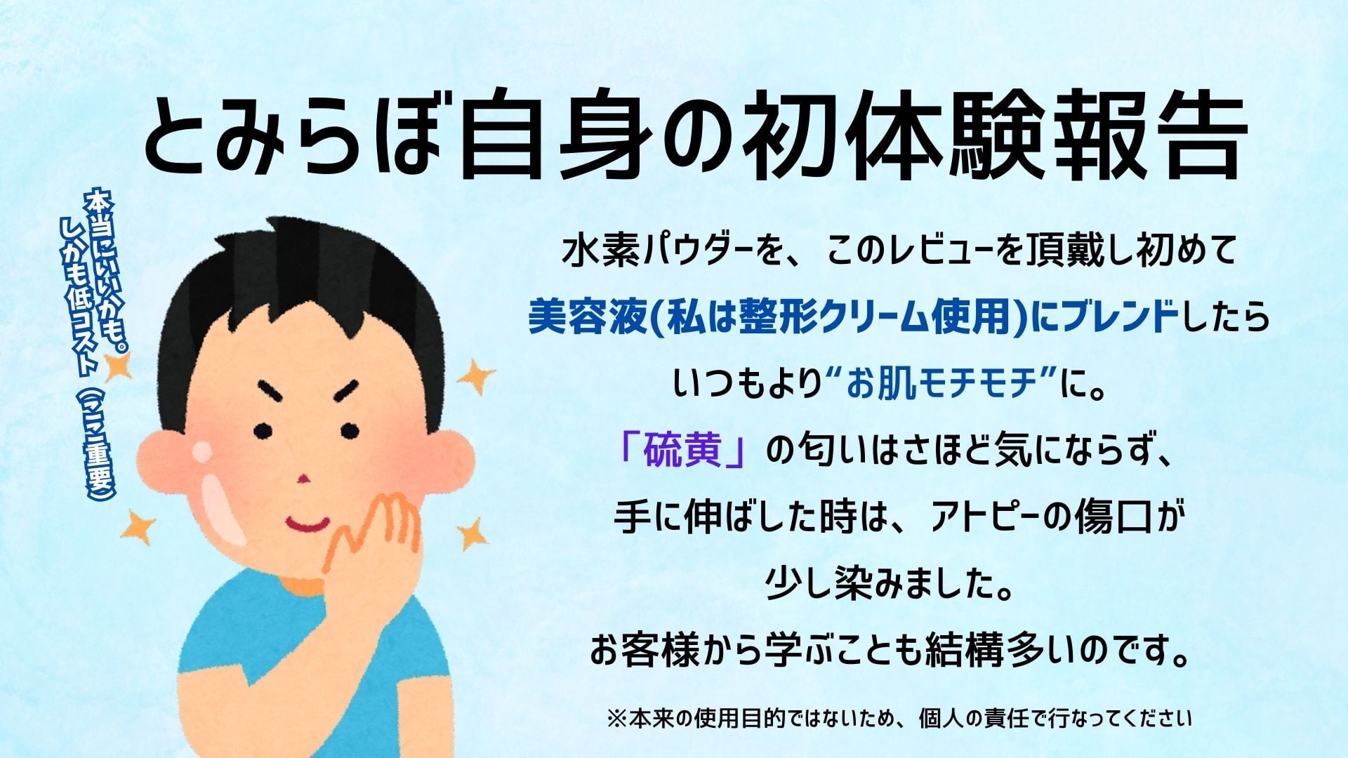 シャンプー・ボディーソープ・化粧水・乳液・ヘアトリートメント・ボディークリーム等にこの水素パウダーを”ひとつまみブレンド”すると、髪・肌のコンディションがものすごくUPするかも?